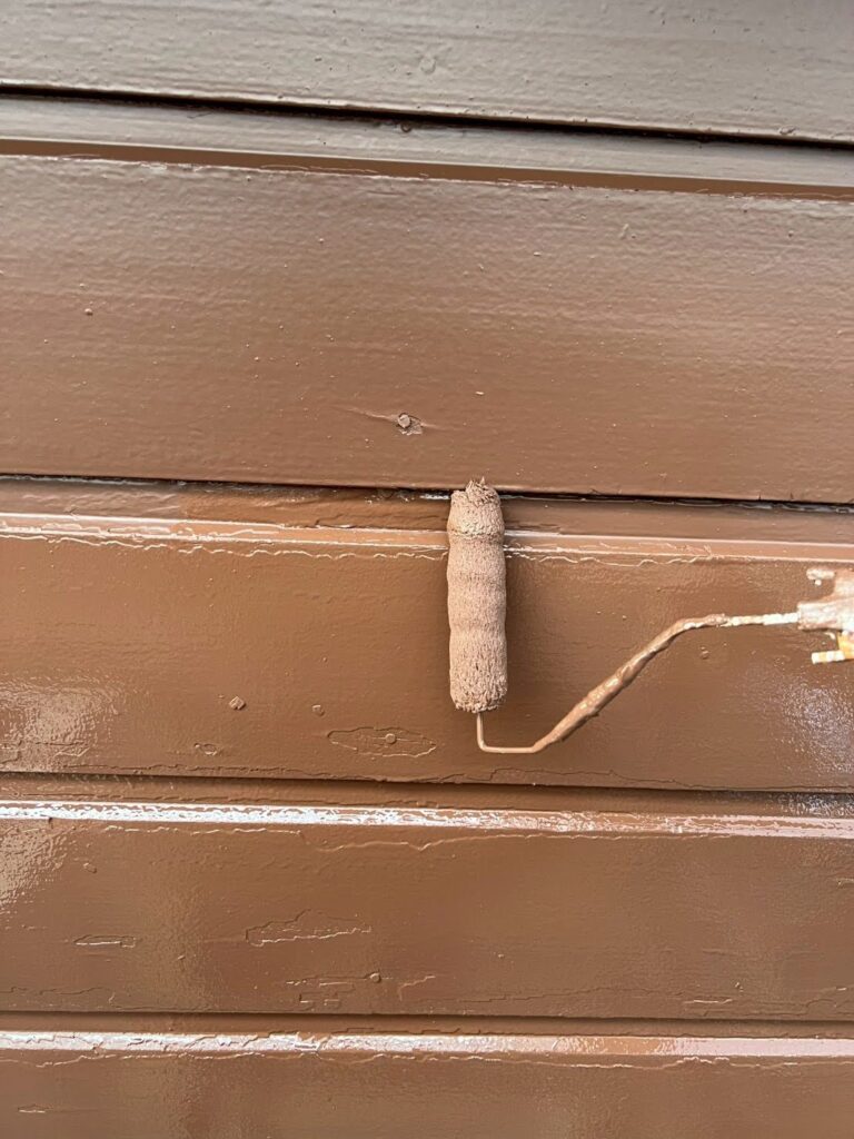 こちらのお住まいは、落ち着いた温かみのあるホワイト系をベースに、ブラウンをアクセントにしたツートン配色の外壁塗装です。