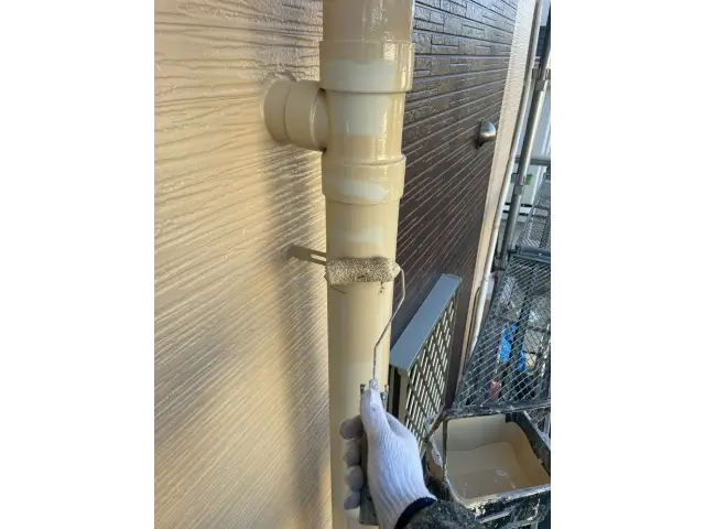 こちらのお住まいは、明るいベージュ系をベースに、ダークグレー(チャコール系)をアクセントとして組み合わせたツートンカラーの外壁塗装です。
